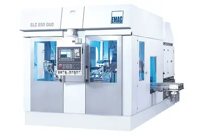ELC 250 DUO Laser Welding System for Powertrain Components The ELC 250 DUO is a compact laser welding system used for the production of gear components. The ELC laser welding system is designed as a DUO alternative with twin spindles. Its two-station operation makes it possible to load and unload the spindles synchronously with the cycle time. Turn-Key Welding System for the Laser Welding of Differential Gear Housings- The ELC 250 DUO laser welding system, developed and built by EMAG LaserTec, is focused on productivity. The dual-spindle construction of the laser welding system, combined with the state-of-the-art EMAG pick-up principle of self-loading spindles, allows for fully automated use of the laser welding machine both as a stand-alone machine as well as in a production line. Using the pick-up spindles offers a variety of advantages: First, this principle allows for the use of fixed lenses since it is the workpiece that moves, not the tool. It also allows for a parallel cycle time for loading and unloading, reducing idle times. There are also major safety advantages gained with the use of the fixed lenses. Primarily that the lasers are always pointed inside the machine, guaranteeing the best protection for the user. Additionally, the beam guidance resulting from this and the selective extraction prevents contamination of the lenses during the welding process. The ELC 250 DUO laser welding system can be equipped with the latest laser technology depending on the requirements of the component and the customer's specifications. It should be noted that although the process takes place at two stations in the ELC 250 DUO, only one laser source is necessary. The laser is simply switched back and forth between both welding stations. The laser's switching between the focusing optics is controlled by a beam switch. The occupancy rate for the laser is therefore optimized, increasing productivity during laser welding.