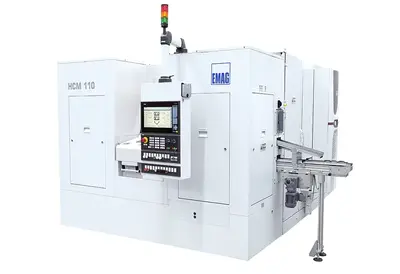 HCM 110 – dual spindle milling machine for ball cage milling The HCM 110 is a dual spindle milling machine for ball cage milling. The machine is designed for both soft and hard milling. Owing to its high precision, this milling machine from EMAG can entirely replace the grinding process for ball cages. - Flexible manufacturing concept for all cage types Due to old legacy machinery, many ball bearing cages for CV joints are still manufactured today using a grinding process. However, a worldwide trend can be observed which is gradually replacing the grinding process with other more efficient technologies to save ancillary production costs. In the conventional grinding process, there are sometimes as many spindles as required by the number of windows in the ball bearing cage. This does not allow for flexible retooling from six to eight windows, for example. With its HCM 110 dual spindle milling machine, EMAG is now offering a flexible manufacturing concept for all cage types that allows for significant cuts to running costs, when compared to manufacturing with grinding processes. - Hard and soft milling with the same machine configuration The HCM 110 milling machine is a dual spindle machine that is specially tailored for the needs of ball bearing cages. The machine produces a high output using the pendulum or DUO principle. Ball bearing cages can be hard or soft milled as required. The process can also be performed dry, with coolant, or with minimal quantity lubrication. - Pendulum principle for the shortest cycle times With the pendulum principle, both milling spindles always machine a cage simultaneously. This is done alternately on one tool spindle and then on the other. While milling is done on one tool spindle, the other is loaded and unloaded outside the machining area. The pendulum principle thus is the machining method with the shortest cycle time. With the DUO principle, the left milling spindle only machines the cage on the left workpiece spindle and the right milling spindle only machines the cage on the right workpiece spindle. A third operating mode is required for cages that have two different window shapes and therefore must be machined with two different tools. That is then referred to as an OP 10/20 operation. A robot that is fully integrated in the machine ensures the highest possible speed when handling the components. Capacity: - Workpiece dia., max.: 110 mm | 4.5 in - Workpiece diameter, min.: 30 mm | 1 in - Workpiece height, min.: 15 mm | 0.5 in
