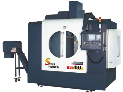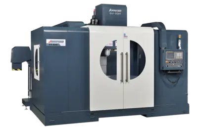 Request A QuoteJohnford 50 taper SV and VMC super vertical machining centers are box-way, geared-head, C-frame machines that feature solid heavily-ribbed Meehanite cast iron construction to eliminate vibration and ensure excellent surface finishes and long cutting tool life. X-Y-Z travels for the 12-machine series range from 33″ x 20″ x 24″ (838 mm x 508 mm x 600 mm) to 120″ x 43″ x 32″ (3000mm x 1075 mm x 800 mm). Four oversized box ways (two on the SV-40H) support the saddle and work table, maximizing X-axis accuracy over the full travel range of the machine, a key factor in maintaining part accuracy and precision. All sliding surface areas and gibs are coated with Turcite-B and hand scraped for precise fit. Large diameter pre-tensioned ballscrews have a double-nut preloaded design to minimize the potential of thermal growth and promote high accuracy and high speed positioning. Available horsepower for the 50-taper spindle ranges from 20 to 35 hp, depending on the machine, with maximum spindle speeds of 6,000 – 15,000 rpm. A two-speed gearbox is standard, with direct/integral drive optional. The motor and gearbox are aligned to ensure no offset and guarantee steady movement of the headstock along the Z axis. The design reduces torsion on the headstock and ensures optimum rigidity, long term accuracy and repeatability. A 24-tool capacity arm-type automatic tool changer is standard, with 30-, 40- and 60-tool versions optional. A comprehensive list of options includes an automatic pallet changer, through-spindle coolant, 4th– and 5th-axis rotary tables, and other equipment packages that enable a user to tailor machine productivity to a specific manufacturing environment.