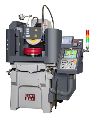 Rotary Grinders The Kent USA Rotary Grinders are capable of working on hard, brittle metal, and mold materials. Our rotary grinders are built with Meehanite Class FC 30 casting for high rigidity and wear resistance, maintaining operation accuracy. This is in addition to their spindle’s lateral design which creates stability during heavy cutting. - Z-axis W/ double V, longitudinal V & flat Turcite way - AC servo motor drive for 3 axes, - 10″ color touch screen with CNC controlled - Auto wheel dressing with compensation - Open top splash guard - Auto lubrication system