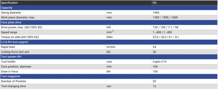 The modular design of the RQ series combines a high cutting force with high precision machining that can be used for all types of railway wheels as well as ring-shaped, difficult-to-cut workpieces from the aerospace and bearing industries. The RQ model is equipped with one turning support for the machining railway wheels.