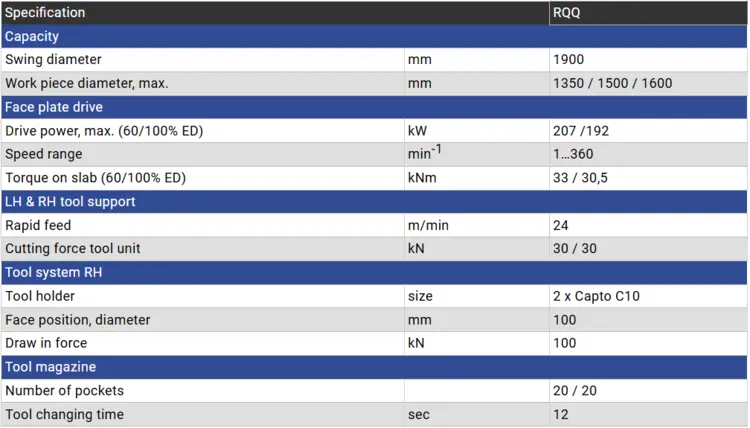 The modular design of the RQ series combines a high cutting force with high precision machining that can be used for all types of railway wheels as well as ring-shaped, difficult-to-cut workpieces from the aerospace and bearing industries. The RQQ model is equipped with twin turning supports for the machining railway wheels.
