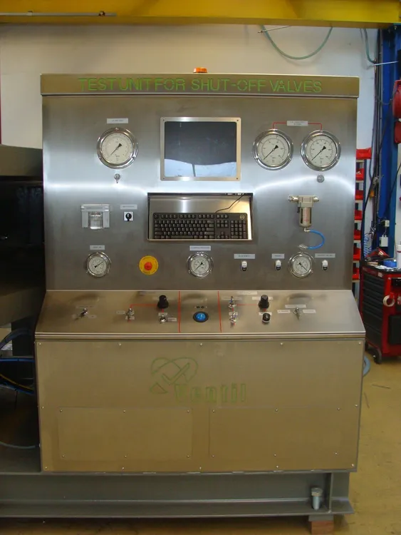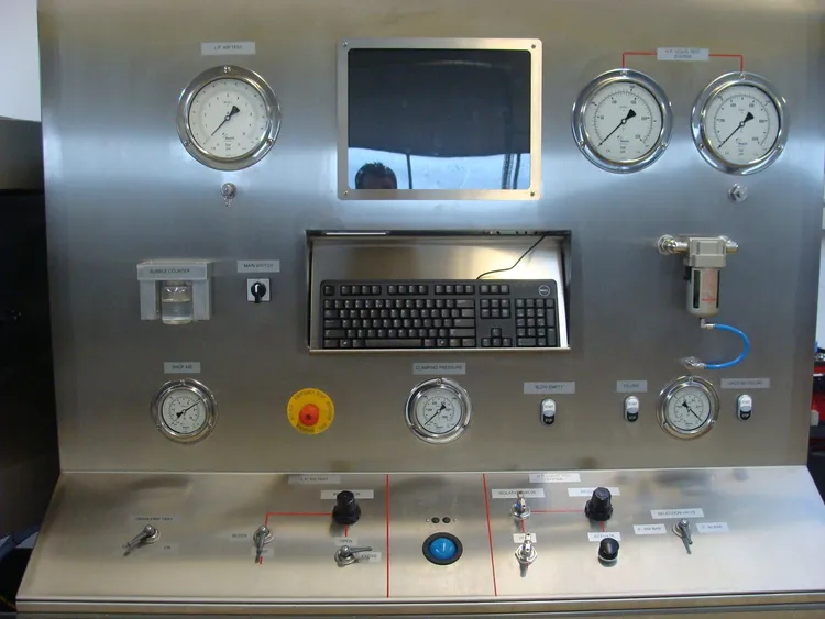 Control panel for operating the clamping system and controlling the test system. The panel is provided with tag plates to identify all operation parts / devices and equipment.