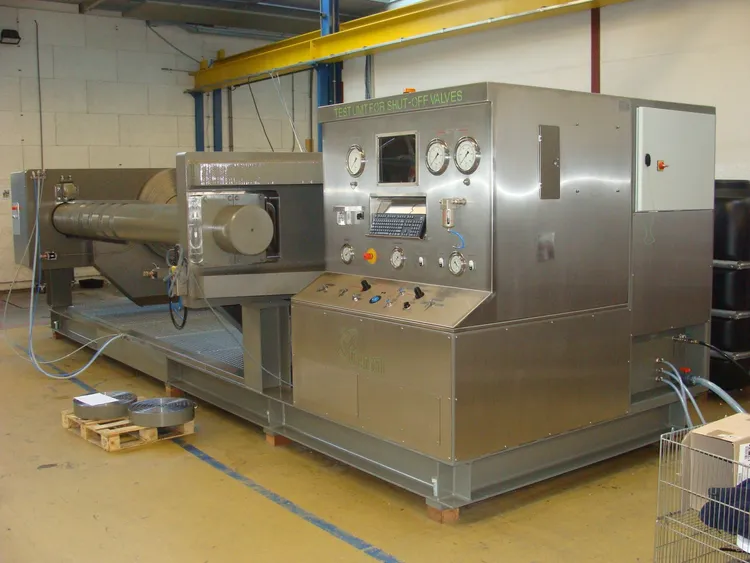 The construction is designed for a maximum clamping force of 1000 ton. The clamping force is automatically adjusted for the valve size which means that the valve is clamped and tested without exposing the valve body to an extreme linear force that can cause stress (deformation) to the valve body. The clamping system is completed with a provision for soft pre-clamping the valve during pre-clamping stage. The clamping system is suitable for both gas- & liquid testing.
