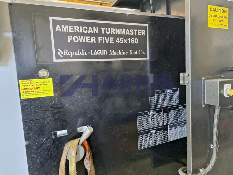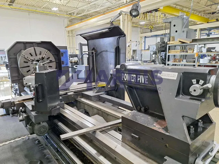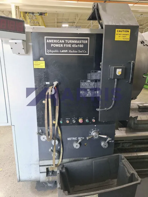 2014 AMERICAN TURNMASTER POWER FIVE-45 lathe, used condition. Features 45" swing over bed, 160" between centers, 10" spindle bore. Equipped with Newall DP700 readout, variable speed headstock, and flood coolant. Motor: 40 HP, Max RPM: 600.